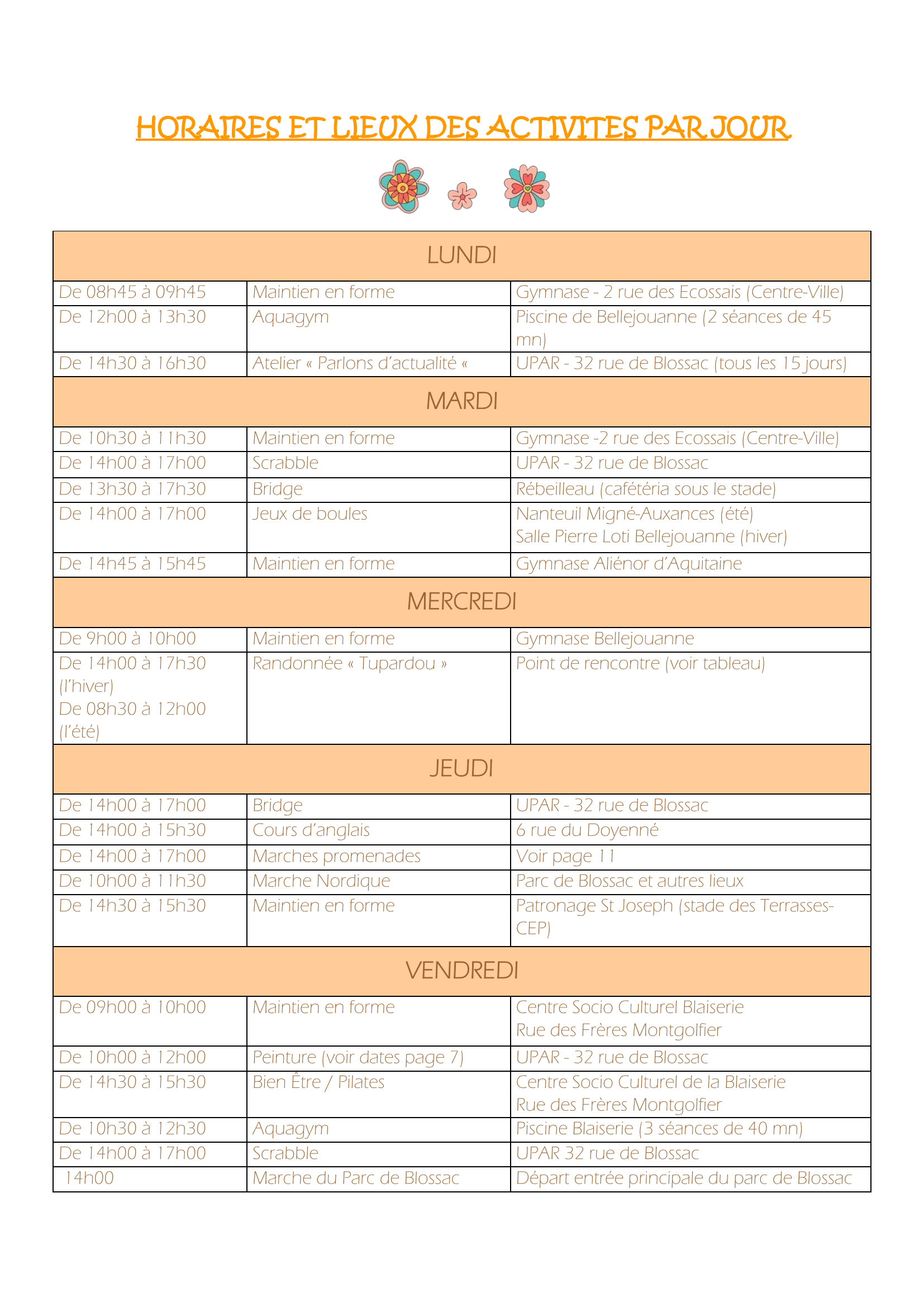 Horaires des activités par jour de la semaine