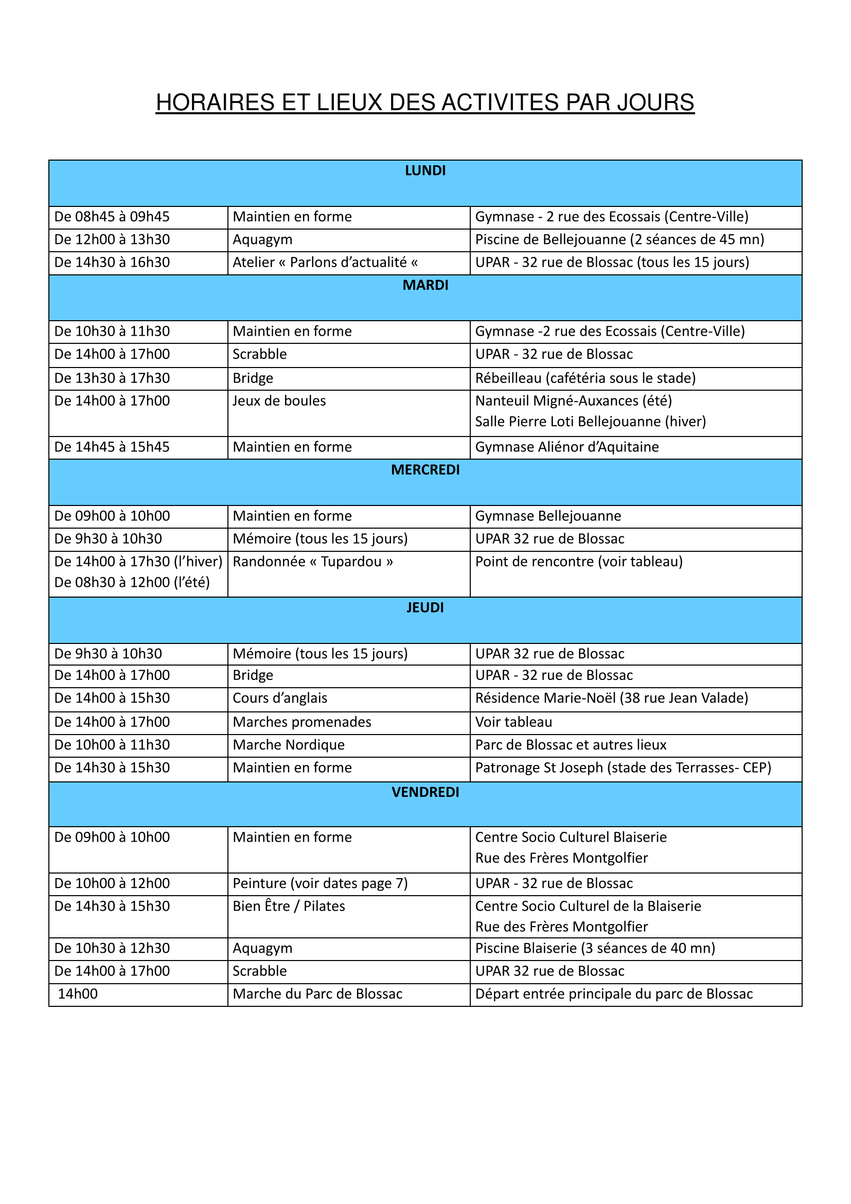 Horaires des activités par jour de la semaine